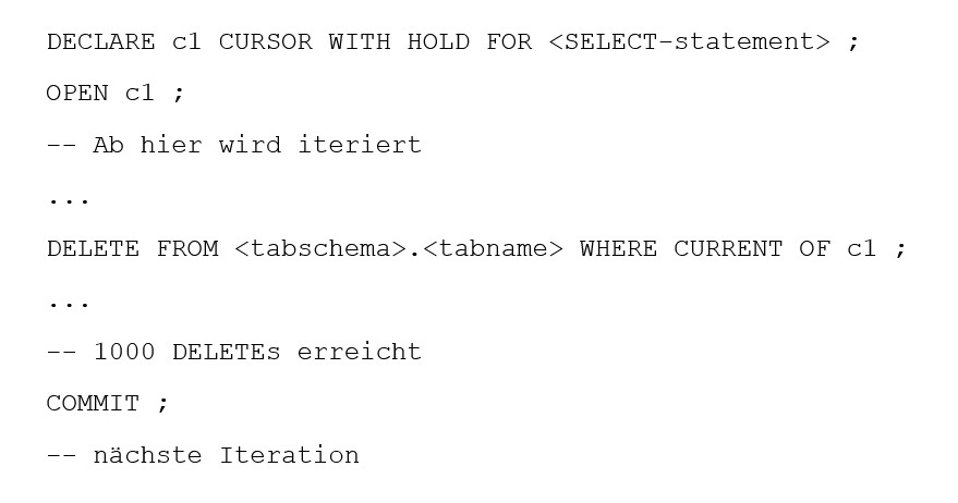 Nach jedem dieser DELETE-Statements wird ein Commit abgesetzt, und in einer While-Schleife wird so lange iteriert, bis keine Zeilen mehr zu löschen sind.